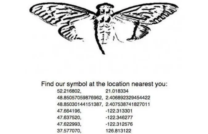 Joel Eriksson, after creating the account, reached a URL instructing him to return at a specific time. Later, it was revealed that the two numbers mentioned in the registration were the dimensions of the original image. This website also featured a countdown and an image of a cicada. When the countdown reached zero, the page refreshed itself with a series of coordinates. These coordinates were the GPS coordinates of telephone poles in countries around the world, including Spain, Russia, America, France, Japan, and Poland.